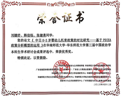 6月9日—6月11日,“第三届中国政治学本科生学术研讨会”在华南师范大学召开。太阳成官网2020级土地资源管理本科生张健勇同学撰写的论文《可持续生计视角下宅基地退出的农户意愿及现实困境研究——基于四川省3县30个村社的调查》获得二等奖,2020级土地资源管理本科生刘婕妤同学撰写的论文《中日0-3岁婴幼儿托育政策的对比研究——基于PDIEA政策分析模型的运用》获得优秀奖。