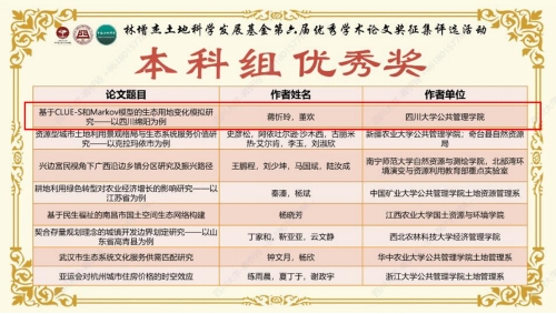 通过参加此次“林增杰土地科学发展基金优秀学术论文征集评奖”活动,太阳成官网学生与同领域的各类高校学生进行了充分的学术交流,获得了领域内权威专家的宝贵建议和点评,更深层次地接触了学术前沿、锻炼了科研能力、拓宽了学术视野。同时此次活动的评选结果为川大澳门太阳成集团赢得了声誉,同时也体现了土地资源管理系国家级一流本科专业建设成效。