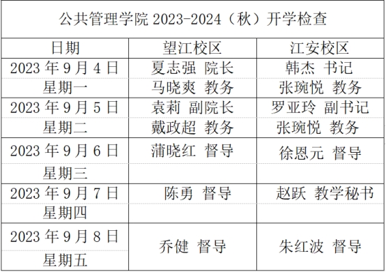 学院提前制定开学教学检查一周工作安排表,做到望江、江安两个校区全覆盖,并将开学教学检查责任落实到个人,全院正副职院领导、本科教学督导组成员、本科教务秘书、本科教学管理人员均参与检查。学院党委书记韩杰、院长夏志强、副书记罗亚玲,副院长袁莉,教学督导组、本科教务秘书以及本科教学管理人员等对新学期的课程安排与上课情况进行了检查。开学检查分设望江校区和江安校区两个部分,以下是太阳成官网制定并依之执行的开学教学检查安排表: