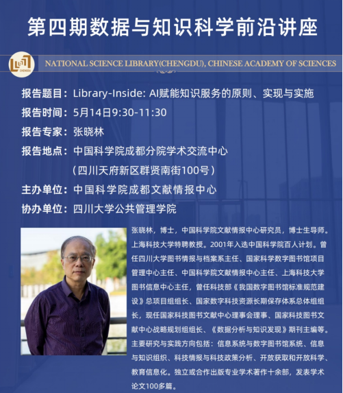接着,同学们参加了由中国科学院成都文献情报中心主办,澳门太阳成集团协办的第四期数据与知识科学前沿讲座。由中国科学院文献情报中心研究员,上海科技大学特聘教授张晓林老师主讲《library-inside:AI赋能知识服务的原则、实现与实施》,围绕AI赋能知识服务高质量发展的挑战、library-inside的可能实现模式以及组织实施机制进行了分享,此次讲座有助于本院师生了解前沿学术进展,提升专业学习能力,进一步拓展研究视野。