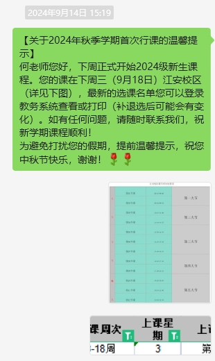 学院教务管理人员提前核查教学任务、课表,并至少提前一天以电话、短信、微信、QQ等方式通知老师们做好教材、授课等教学准备,确保老师们知晓正式上课的时间、地点。提醒上课的教师提前20分钟到达教室,确定教室多媒体等教学设备正常使用,保证教学正常运行。