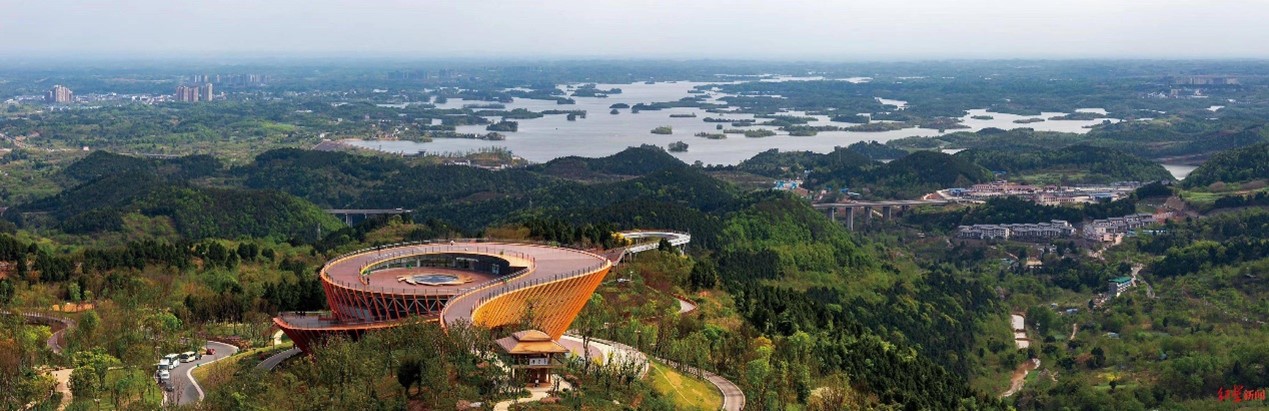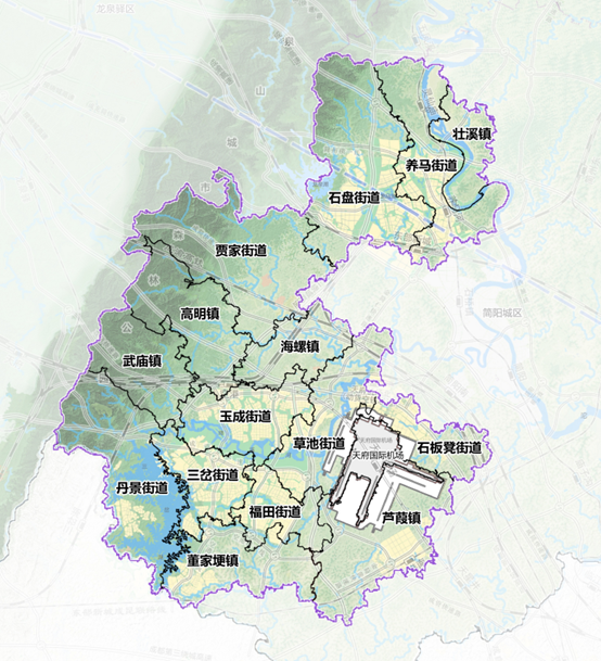 成都东部新区发展定位为加快建设成为国家向西向南开放的国际空港门户枢纽、成渝相向发展的新兴极核、引领新经济发展的产业新城、彰显天府文化的东部家园。成都东部新区内部坚持公园城市发展理念,秉承山水丘陵特色,按照城市组群模式,构建了“双城一园,一轴一带”的空间格局。其中,“双城”是指空港新城和简州新城;“一园”是指天府奥体公园;“一轴”是指沱江发展轴,“一带”是指金简仁产业带。